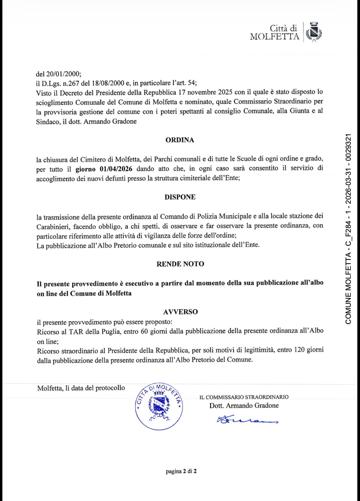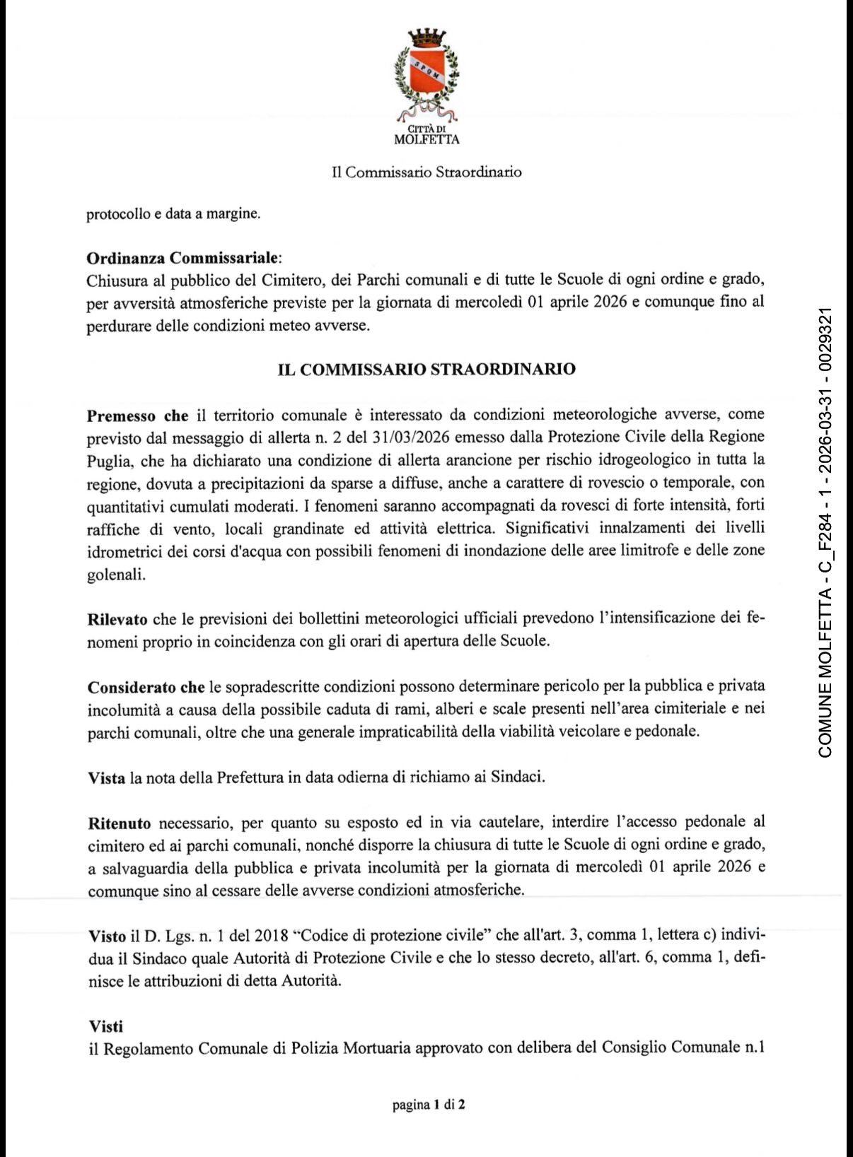 Descrizione Su disposizione del Commissario straordinario, causa allerta meteo arancione, per motivi di sicurezza le scuole di ogni ordine e grado, il cimitero e i parchi comunali, nella giornata di domani 1 aprile resteranno chiusi.
