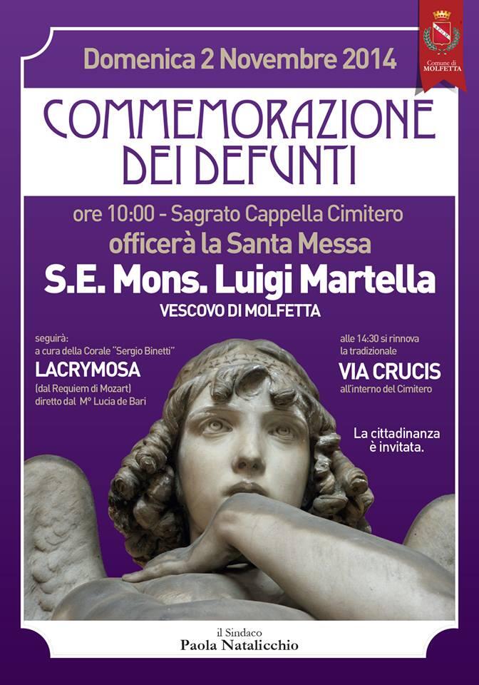 Il 2 novembre si svolgerà la tradizionale giornata di commemorazione dei defunti. Alle ore 10 sul sagrato della Cappella del Cimitero sua eminenza Mons. Luigi Martella officerà la Santa Messa alla presenza delle autorità e dei fedeli. Seguirà: Lacrymosa, tratto dal Requiem di Mozart, a cura della corale "Sergio Binetti", diretta dal M° Lucia de Bari e la deposizione delle corone di alloro.