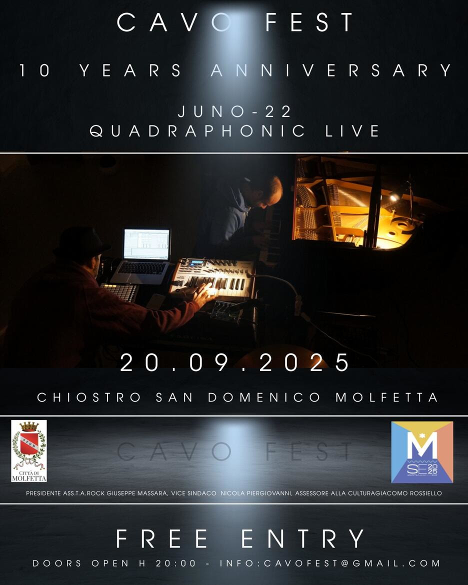 Il 20 settembre 2025 il Cavo Fest approda a Molfetta per il suo decimo anniversario (2015-2025), portando al Chiostro San Domenico uno spettacolo unico nel suo genere: QUADRAPHONIC, firmato dal duo pugliese JUNO22. L’evento, inserito nel cartellone “Molfetta Summer Edition 2025”, promosso dal Comune di Molfetta, assessorato alla cultura, sarà a ingresso libero con apertura porte alle 20.00.
