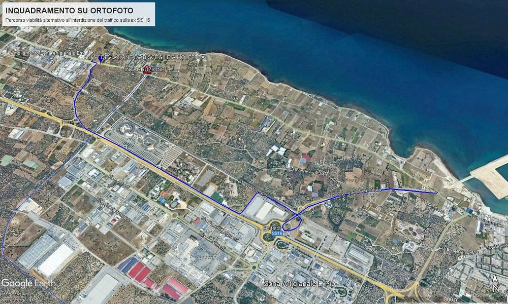 Il traffico, in direzione Bisceglie, dovrà percorrere il seguente tragitto: Via Bisceglie, Via dei lavoratori, sovrappasso ferroviario, rotatoria Via dei lavoratori, Via dei pescatori, Via dei portuali, complanare outlet, svincolo Bisceglie sud direzione Bisceglie e viceversa da Bisceglie in direzione Molfetta.
