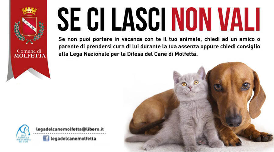 Il Comune di Molfetta e la Lega del cane insieme per una campagna contro l'abbandono. "Se ci lasci non vali" è il messaggio lanciato per sensibilizzare i cittadini e evitare che, come purtroppo spesso accade, proprio in corrispondenza delle partenze per le ferie estive si consumano irresponsabili casi di abbandono di animali domestici.