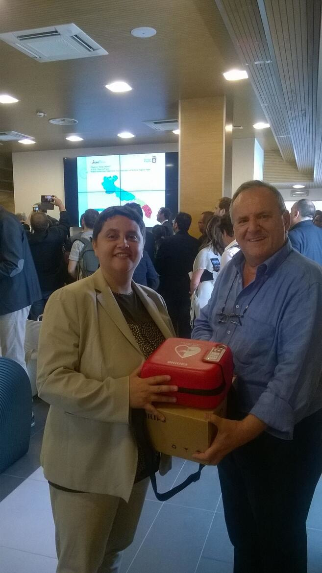 "C'è uno strumento al servizio dello sport che è più importante di una nuova panchina o di un nuovo canestro perché al servizio della vita delle persone che era assente dai nostri palazzetti e dai nostri campi di calcio. È il defibrillatore con il quale è possibile intervenire per salvare chi è colpito da arresto cardiaco. Ringrazio la Regione Puglia che ci ha permesso di colmare questa lacuna dotando le nostre più importanti strutture sportive di questo strumento di prevenzione". Così il sindaco di Molfetta Paola Natalicchio al termine dell'incontro di consegna dei defibrillatori semiautomatici esterni che si è svolto questa mattina nella sede regionale di via Gentile il Presidente uscente della Regione Puglia Nichi Vendola e il neo eletto Michele Emiliano.