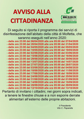 Si invitano i cittadini a tenere, nei giorni delle operazioni, le finestre chiuse e a non esporre derrate alimentari all’esterno delle proprie abitazioni.