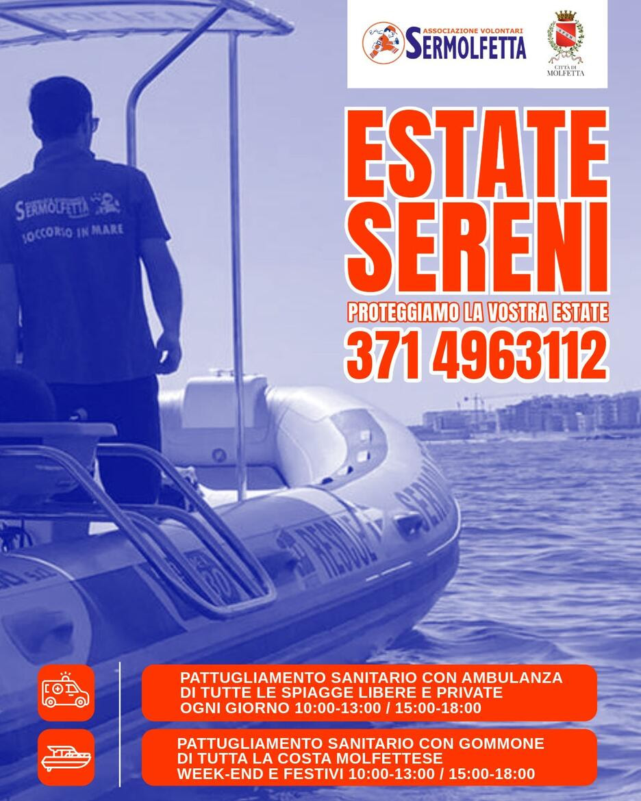 Dal 15 maggio a 31 agosto prossimo lungo le spiagge libere torna il servizio di salvataggio, assistenza sanitaria e attività di formazione-prevenzione, realizzato da SerMolfetta, Misericordia e AVS Molfetta, finanziato dal Comune.