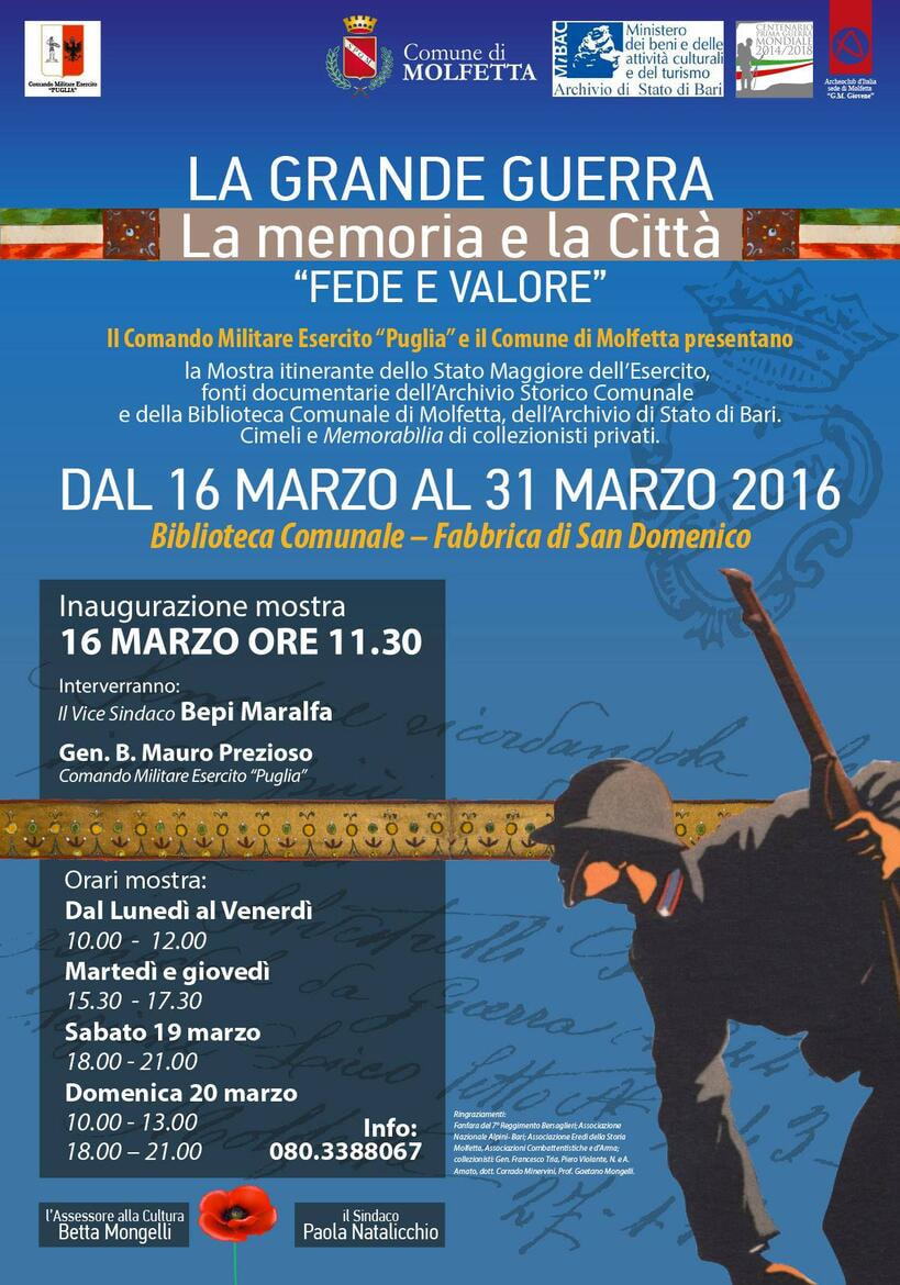 La mostra itinerante dello Stato Maggiore dell'Esercito, "Fede e valore", arricchita dalle fonti documentarie dell'Archivio Storico Comunale e della Biblioteca Comunale di Molfetta, dell'Archivio di Stato di Bari approda a Molfetta nelle sale della biblioteca comunale presso Fabbrica di San Domenico. Sarà inaugurata il 16 marzo alle ore 11.30 con la partecipazione del Vice Sindaco di Molfetta Bepi Maralfa e del Generale di Brigata Mauro Prezioso, Comandante Regionale dell'Esercito in Puglia.