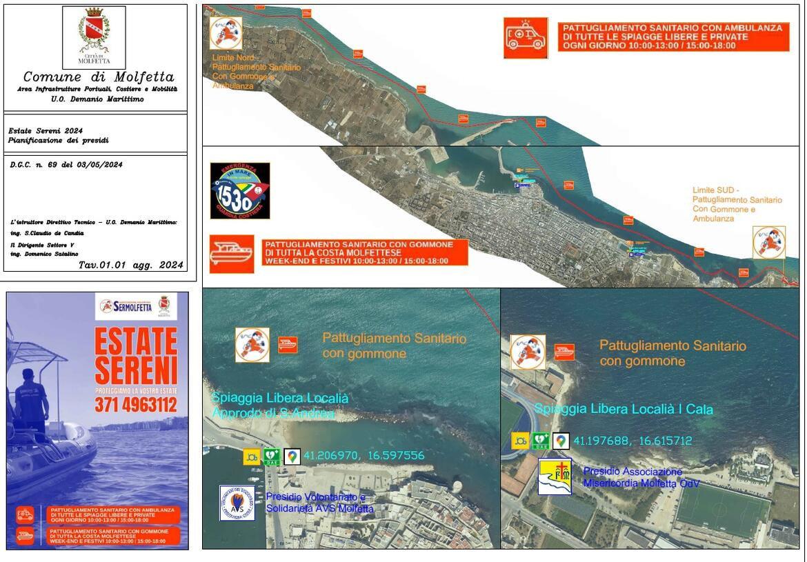 Lungo il litorale sarà garantito il servizio di pattugliamento sanitario, nell’ambito del Progetto Estate sereni, affidato dal Comune al Sermolfetta, con ambulanza dotata di defibrillatore e personale specializzato, dalle 10 alle 13 e dalle 15 alle 18.