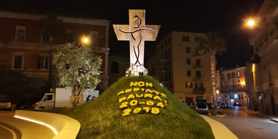 I fiori disegnano parole di pace sotto la Croce, che guarda il Seminario vescovile, collocata ad aprile dell’anno scorso, per ricordare la visita di Papa Francesco, venuto a Molfetta in occasione del 25 anniversario della morte di don Tonino Bello, vescovo amato ed indimenticato.