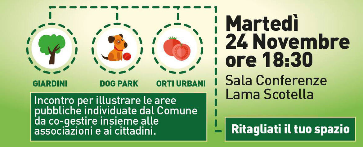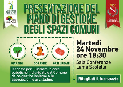 Il piano per la migliore gestione del verde, la creazione dei primi dog park e orti urbani che vede il coinvolgimento attivo di cittadini, associazioni, imprese e enti sul territorio sarà presentato domani, martedì 24 novembre alle ore 18.30 nella sala conferenze di lama scotella (via Martiri di via Fani) nell'ambito dell'intergruppo del Forum Agenda 21. Interverranno il sindaco di Molfetta Paola Natalicchio, l'assessore all'ambiente Rosalba Gadaleta, l'assessore alla cura della città Marilena Lucivero, il Coordinatore del Forum Cosimo Sallustio, il Commissario di Agenda 21 Giuseppe Ciccolella.