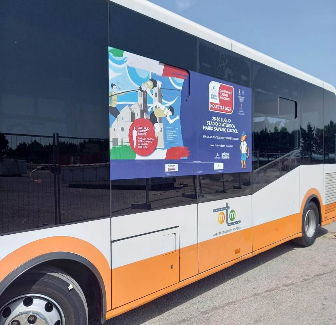 Sono quattro i bus del parco mezzi dell’Mtm, Molfetta mobilità e trasporti, che, in occasione degli Assoluti nazionali di atletica, di scena a Molfetta dal 28 al 30 luglio prossimi, hanno “indossato” i colori dei Campionati, con logo e mascotte disegnati dagli studenti degli istituti scolastici di Molfetta. Nello specifico il logo disegnato da Donato Gramegna, studente dell’ultimo anno dell’Ipssar Molfetta, e la mascotte disegnata da Miriam Albergo, studentessa della terza A del liceo artistico del Monsignor Bello.