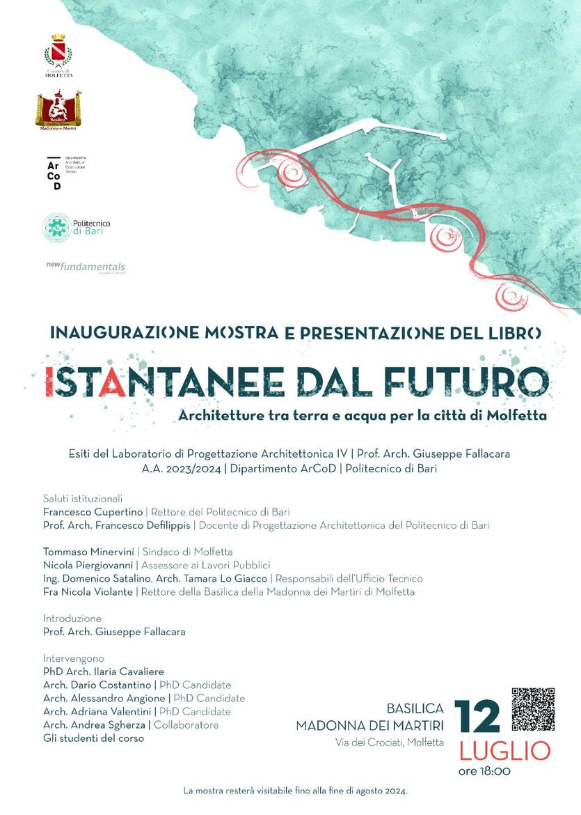 “Istantanee dal futuro: architetture tra terra e acqua per la città di Molfetta” sarà presentato al pubblico, venerdì, 12 luglio, ore 18,30, presso la sala Padre Martini della Basilica Minore Pontificia, Madonna dei Martiri di Molfetta. Per l’occasione saranno esposti nella mostra 10 totem progettuali che raccontano le varie ipotesi di progetto delle tre zone di Molfetta prese in considerazione assieme all’amministrazione comunale e sviluppate in maniera critica dagli studenti del corso di progettazione architettonica.