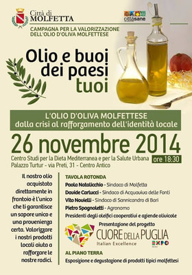 Oggi presso il Centro per la Salute Urbana e la Dieta Mediterranea della Sala Turtur, in via Preti 31 (Centro Antico) alle 18.30, il Comune di Molfetta promuove una serata di riflessione sull'olio.