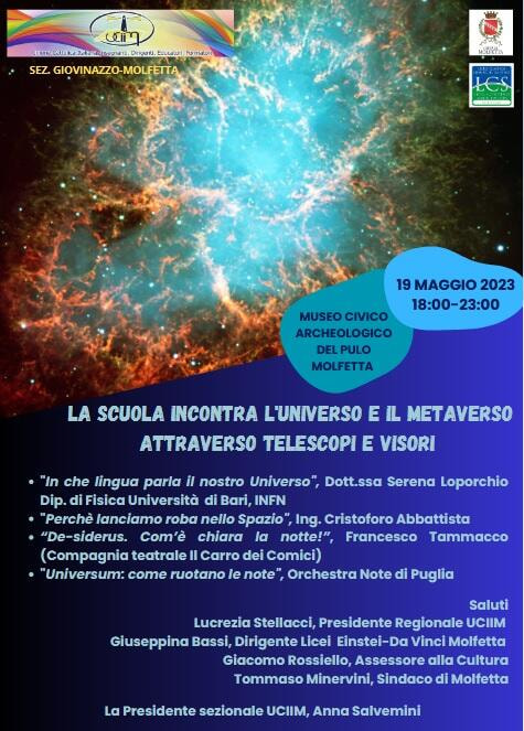 Si terrà a Molfetta, presso il Museo Civico Archeologico del Pulo, il 19 maggio, dalle ore 18 alle ore 23, “La Scuola incontra l’Universo e il Metaverso attraverso i telescopi e i visori”, evento, aperto al pubblico, promosso dall’Associazione UCIIM (Unione Cattolica Italiana Insegnanti, Dirigenti; Educatori, Formatori) e patrocinato dal Comune di Molfetta.