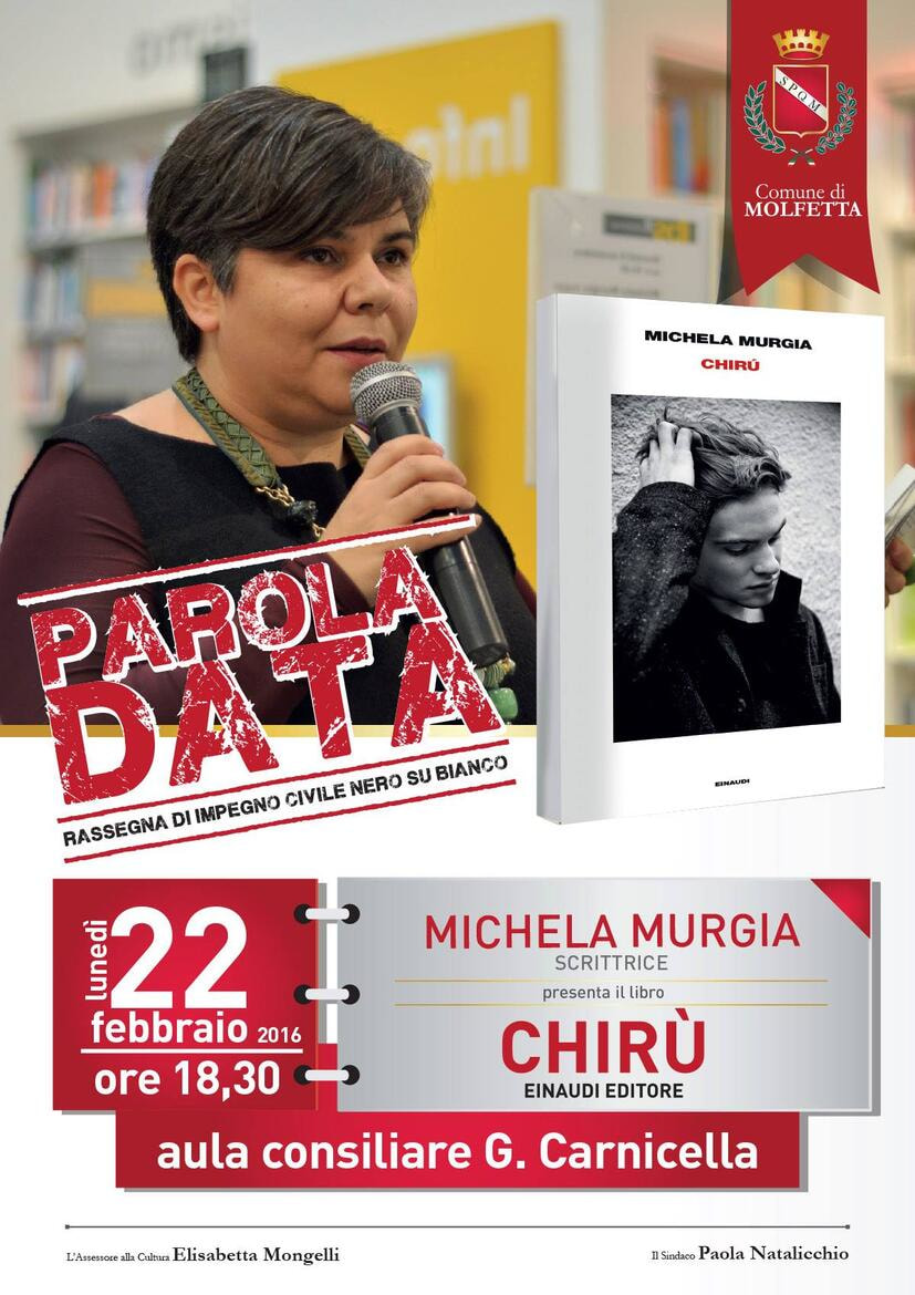 Per la "Rassegna di impegno civile nero su bianco. Parola data" promossa dal Comune di Molfetta lunedì 22 febbraio ci sarà alle ore 18.30 presso la sala consiliare del Comune la presentazione del libro "Chirù" con la scrittrice Michela Murgia.