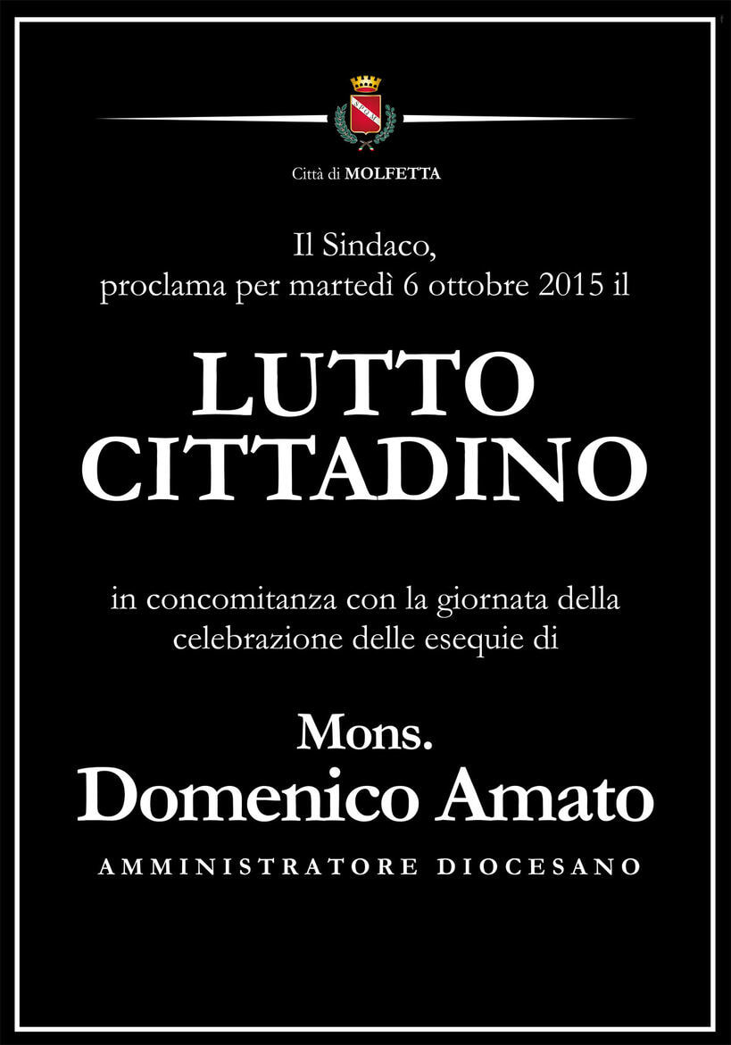 Il Sindaco per martedì 6 ottobre proclama il lutto cittadino in concomitanza della celebrazione delle esequie dell'Amministratore Diocesano Mons. Domenico Amato.