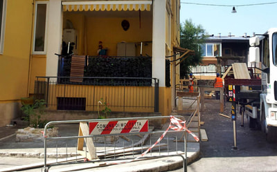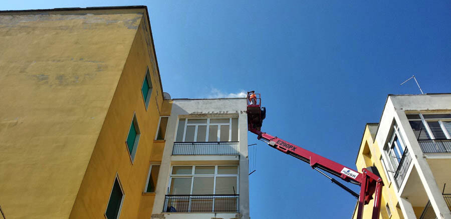 La ditta che sta eseguendo i lavori sta picchiettando, tagliando e rimuovendo tutte le parti instabili e sta recintando le palazzine per evitare anche successivamente il passaggio pedonale nelle stesse aree.