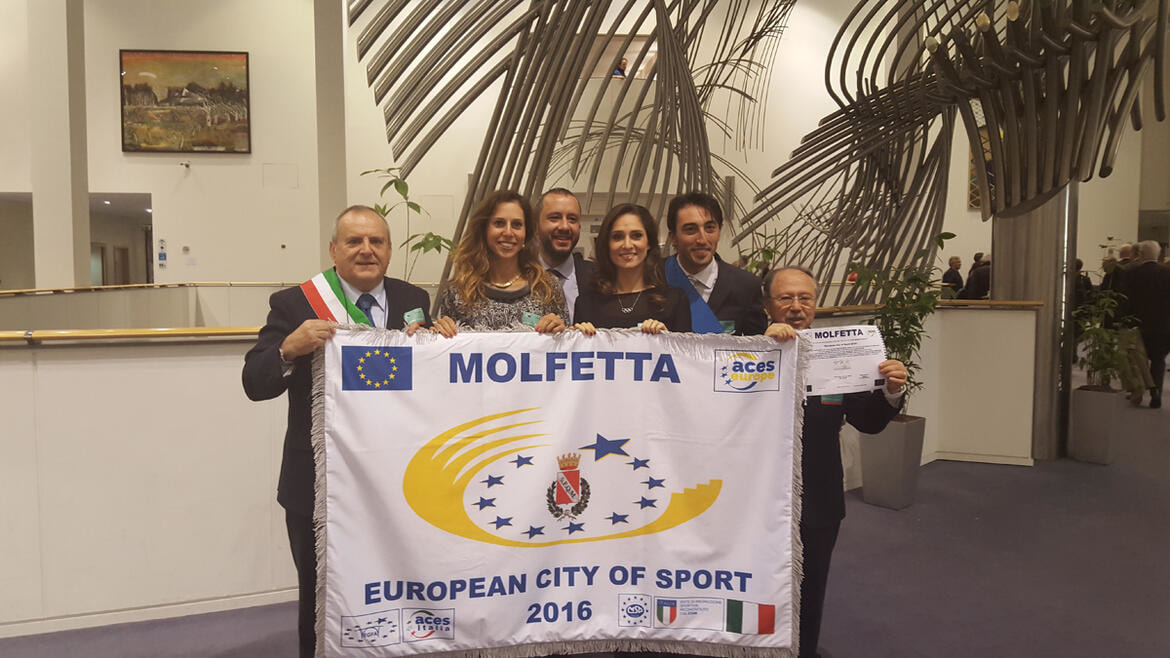Molfetta è ufficialmente città europea dello sport, unica in Puglia e tra le 31 comunità europee che hanno deciso il prossimo anno di investire nella promozione dei valori sportivi. Ieri pomeriggio al Parlamento europeo c'è stato il passaggio di testimone tra le Capitali dello sport: Torino 2015 e Praga 2016 e la consegna delle Bandiere per le città europee, rilasciate da Aces Europe.