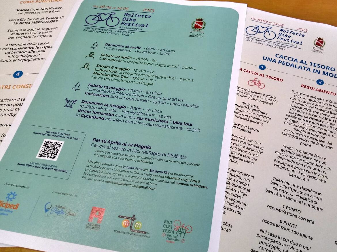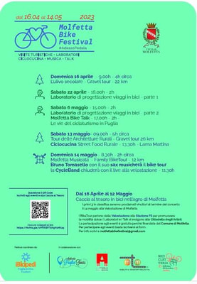 Appuntamenti sono previsti fino al 14 maggio. Quest’anno il Festival si arricchisce anche di una Caccia al tesoro in bici, nell’agro di Molfetta, in modalità self guided.