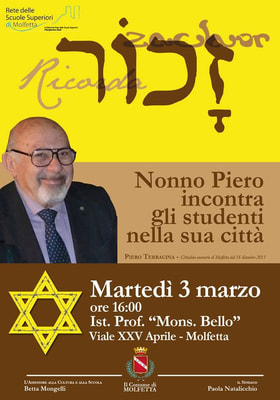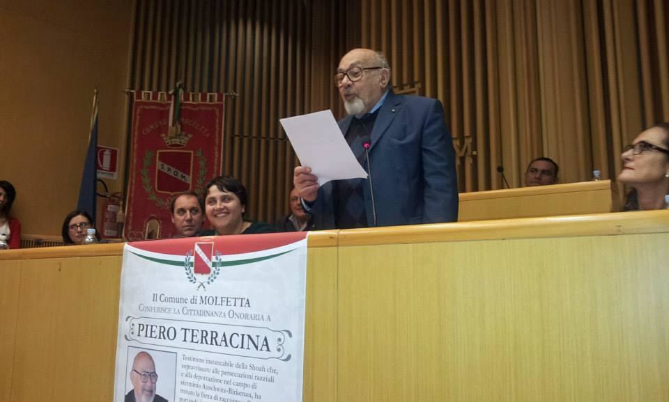 Tornare nella sua città onoraria è per Piero Terracina sempre un'emozione, soprattutto quando la sua visita si incrocia con gli studenti. L'incontro del testimone della Shoah, sopravvissuto alle persecuzioni razziali e alla deportazione nel campo di sterminio Auschwitz-Birkenau che la Città di Molfetta ha insignito a dicembre 2013 della cittadinanza onoraria, avverrà alle ore 16 nell'aula magna dell'Istituto Professionale "Mons. Bello" (Viale 25 aprile).