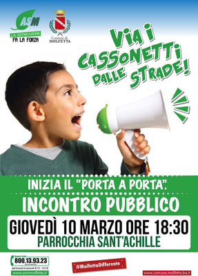 In vista della partenza anche nella terza zona della raccolta porta a porta l'amministrazione comunale e la Asm tornano a confrontarsi con i cittadini in un incontro pubblico giovedì 10 marzo alle ore 18.30 nell'auditorium della parrocchia Sant'Achille. Interverranno l'assessore all'ambiente Rosalba Gadaleta, il presidente della Asm Antonello Zaza e i responsabili della società di consulenza "Sintesi" che sta affiancando l'azienda nelle fasi di passaggio al nuovo servizio.