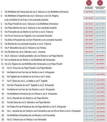Il divieto di fermata a lati alterni nei giorni dispari (1, 3, 5 del mese in corso) e giorni pari è valido nella fascia oraria dalle 8 alle 10 (escluso i giorni festivi e il giovedì) come già indicato dalla segnaletica verticale presente (e in grafica) e sono chiamati a osservarlo non solo i residenti ma tutti coloro che per lavoro o per fare la spesa lasciano in sosta la propria auto negli orari coperti dalla pulizia.