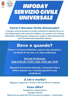 Il 30 gennaio prossimo i volontari del servizio civile universale, impegnati nei progetti "UP2023", "Monitor2023" e "In Reading2023", allestiranno un infoday presso la sala conferenze della sede comunale di Via martiri di Via Fani, dalle 09:00 alle 13:00 e dalle 15:00 alle 19:00.