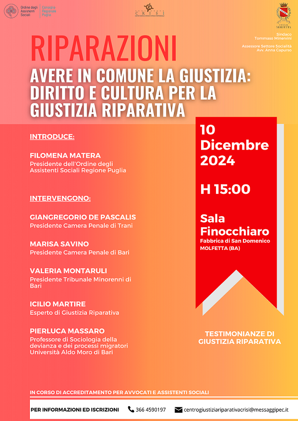 Il Centro di Giustizia Riparativa del Comune di Molfetta, gestito dalla cooperativa Crisi, organizza martedì 10 dicembre, alle 15, presso la sala Finocchiaro della Fabbrica San Domenico l’evento formativo “Riparazioni. Avere in comune la giustizia: diritto e cultura per la giustizia riparativa”.