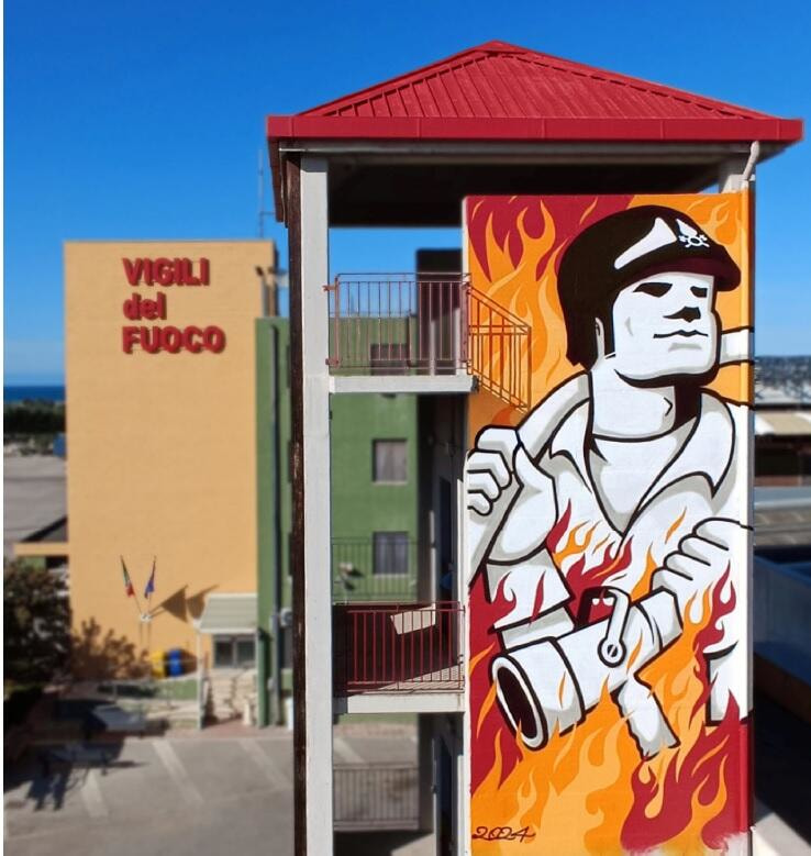 Il murale, opera di Filippo Campana, vigile del fuoco e artista, vuole essere un tributo all'impegno, al coraggio e al sacrificio dei Vigili del Fuoco, sempre pronti a soccorrere la cittadinanza in caso di pericolo. Rappresenta un vigile del fuoco impegnato nell'eroico compito di domare le fiamme.