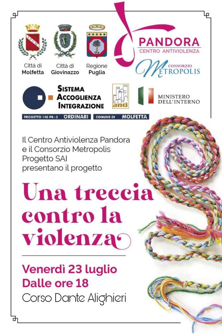 Venerdì 23 luglio, a partire dalle 18, su Corso Dante, si terrà “Una treccia contro la violenza” iniziativa che punta alla sensibilizzazione contro la violenza sulle donne, ma anche contro la tratta delle donne, coinvolgendo il maggior numero di persone. Nell’occasione, tutti coloro che lo vorranno potranno farsi coinvolgere e, gratuitamente, potranno ricevere in dono e farsi applicare una treccia tra i capelli.