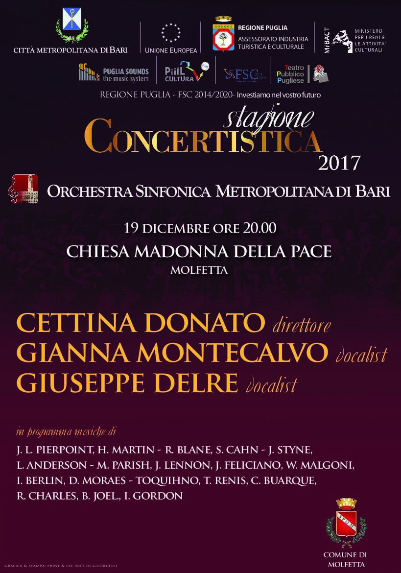 Descrizione STAGIONE CONCERTISTICA 2017ORCHESTRA SINFONICA METROPOLITANA DI BARI19 DICEMBRE ORE 20.00CHIESA MADONNA DELLA PACEMOLFETTAmanifesto_19 dicembre