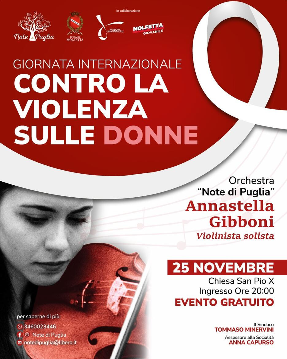 Un messaggio di speranza e solidarietà attraverso la bellezza della musica. Nella parrocchia San Pio X di Molfetta, in occasione della Giornata Internazionale contro la violenza sulle donne, il prossimo 25 novembre, alle 20, l'orchestra al femminile Note di Puglia si esibirà in un concerto eseguendo musiche di Mozart e Mendelssohn. Ospite della serata sarà la violinista Annastella Gibboni, giovane talento musicale, pluripremiata.