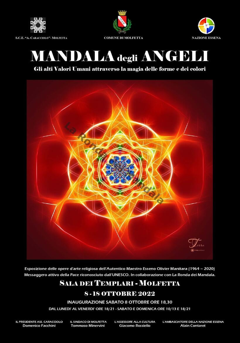 La Nazione Essena, nella suggestiva Sala dei Templari a Molfetta, Città della Pace, presenta la mostra "Mandala degli AngeliI" – Gli alti Valori Umani attraverso la magia delle forme e dei colori. Per la prima volta in Italia, dall'8 al 18 ottobre, saranno esposti 30 Mandala degli Angeli, bellissime opere d’arte religiosa dell’Autentico Maestro Esseno Olivier Manitara (1964 – 2020), rappresentante del popolo esseno, messaggero attivo della Pace, riconosciuto dall’Unesco.