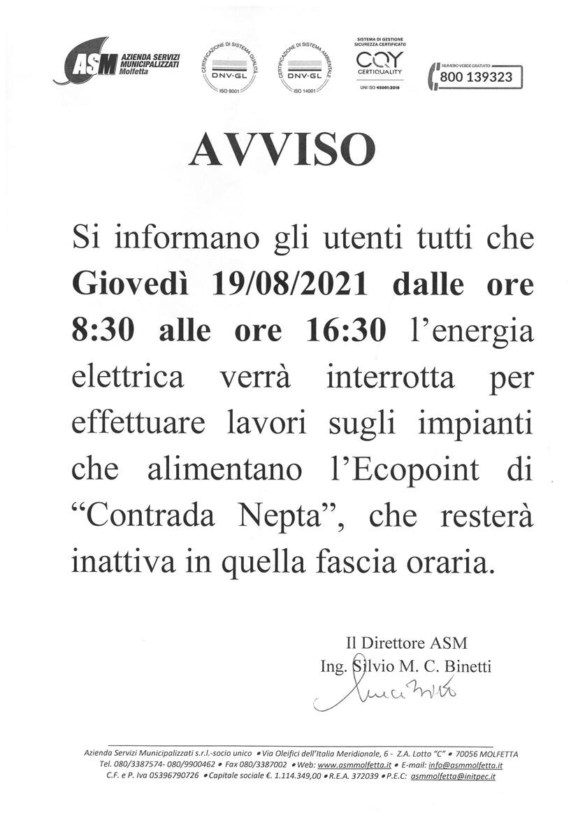 ASM - avviso interruzione energia elettrica - Contrada Nepta - giovedì 19 agosto 2021