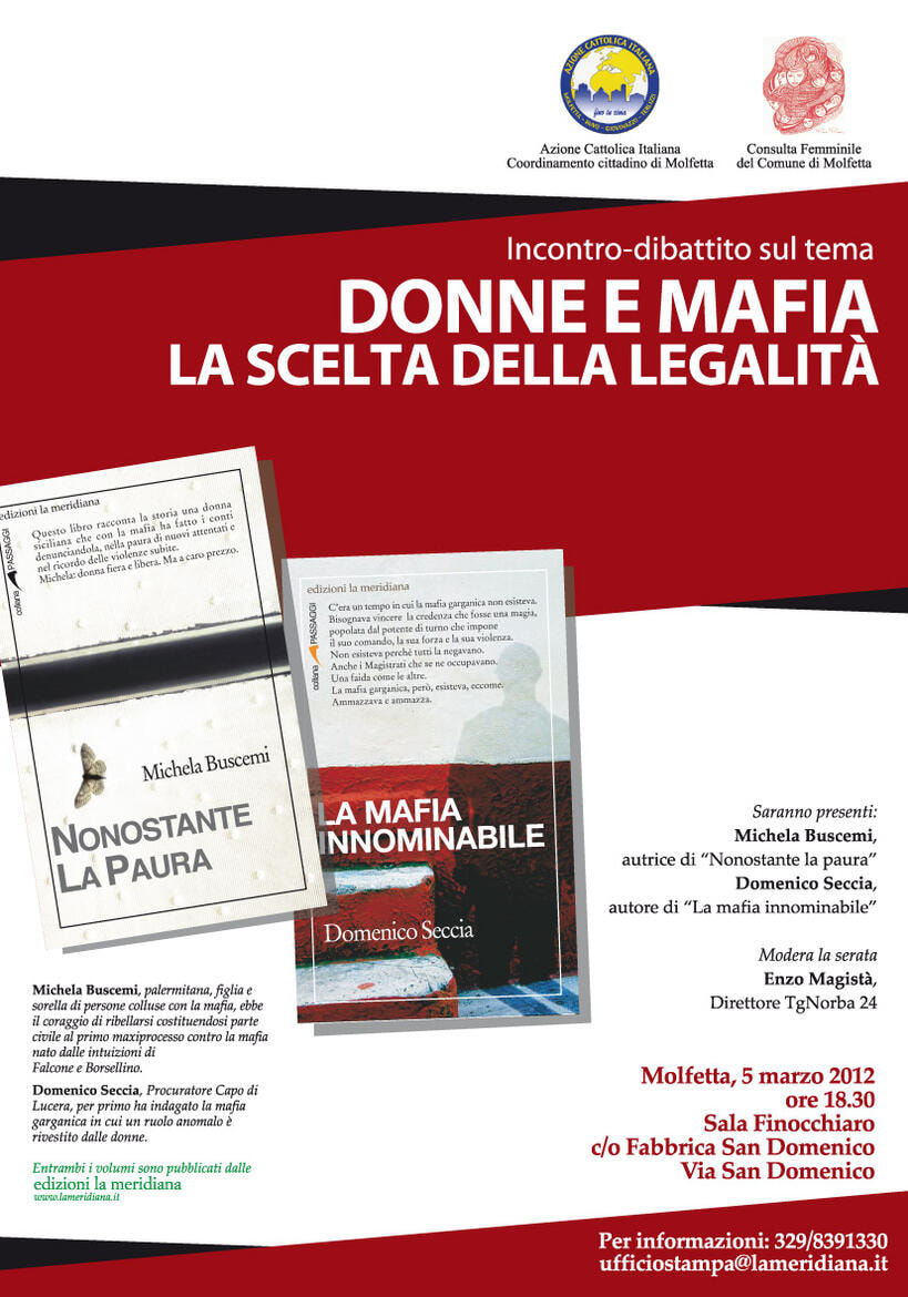 Nel primo il Procuratore Capo di Lucera Domenico Seccia ricostruisce la storia della mafia garganica (che ha per primo indagato e studiato) in cui un ruolo anomalo e cruciale è rivestito dalle donne. Nell'altro Michela Buscemi, palermitana, figlia e sorella di persone colluse con la mafia, racconta la sua ribellione al sistema che avvenne costituendosi parte civile al primo maxiprocesso contro la mafia.