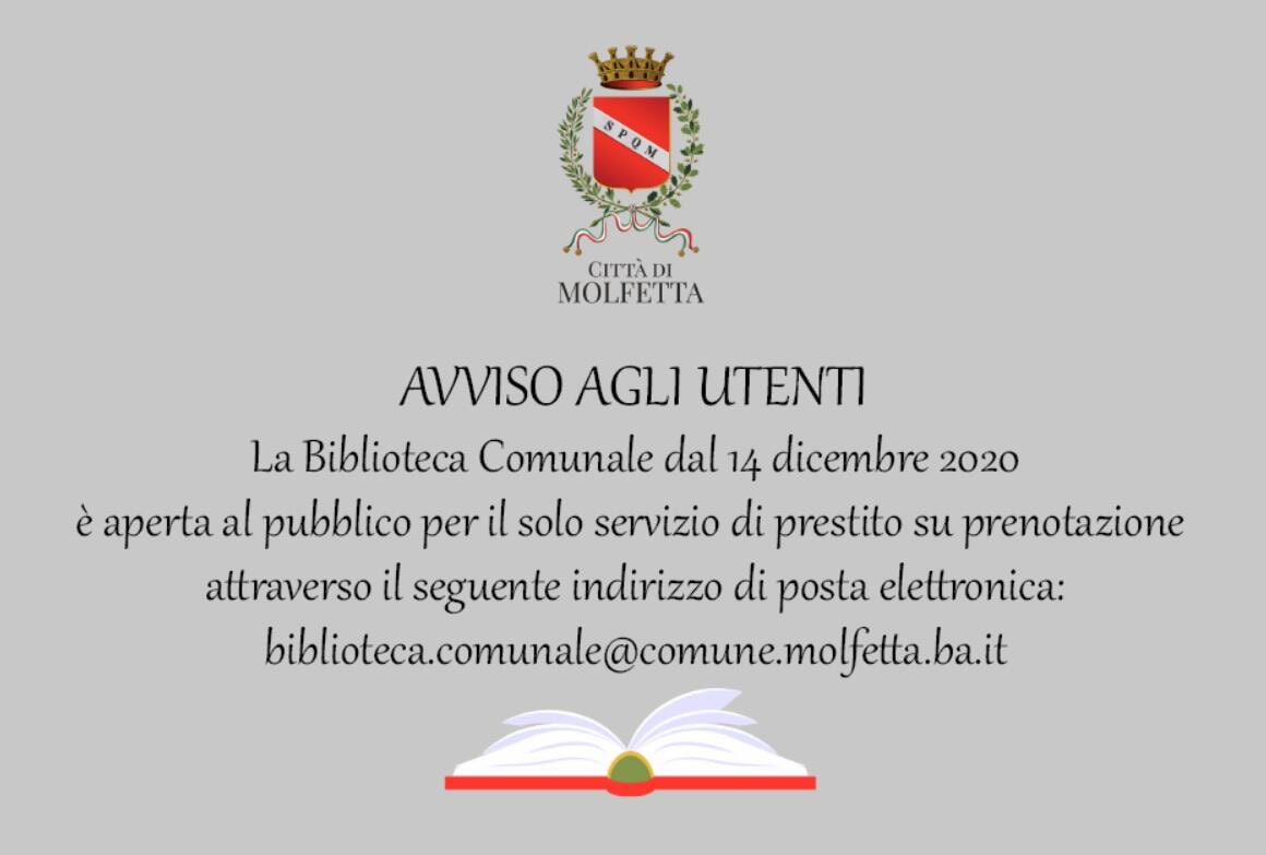 Descrizione A partire dal 14 dicembre scorso, presso la Biblioteca comuanle, è attivo il servizio di prestito su prenotazione. Quanti volessero accedervi possono scrivere a biblioteca.comunale@comune.molfetta.ba.it
