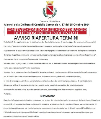 Descrizione Galleria immagini Comitato comunale di monitoraggio dei fenomeni delinquenziali comune di Molfetta 12 10 2018