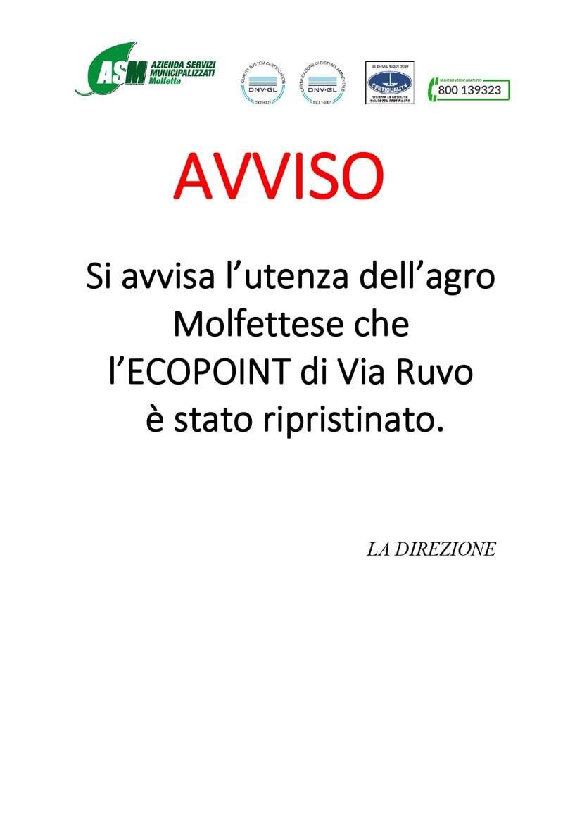 Comunicazione Asm. Ripristinato l'ecopoint di Via Ruvo