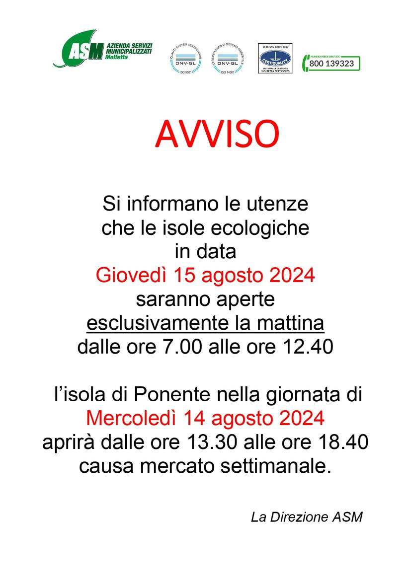 L'isola ecologica di ponente, il 14 agosto, causa mercato settimanle, sarà aperta dalle 13.30 alle 18.40.