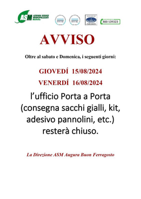L'ufficio Porta a Porta resterà chiuso giovedì 15 e venerdì 16 agosto.
