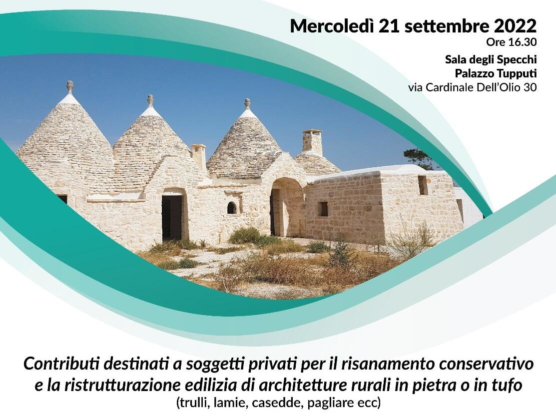 Il bando si rivolge a proprietari privati di trulli, lamie, casedde, pagliari, in pietra o in tufo, a secco e non, realizzati entro la prima metà del secolo scorso.