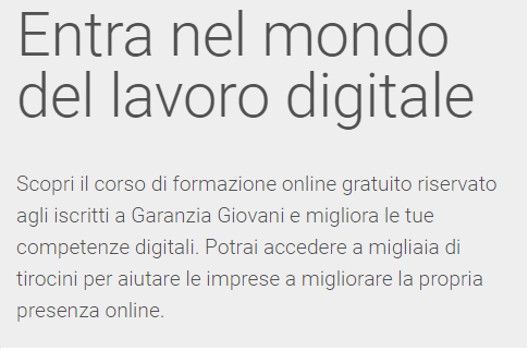 Questa iniziativa possiede come obiettivo principale quello di fornire, mediante specifiche attività di formazione, competenze digitali ai giovani che non studiano e non lavorano, favorendo l’ingresso nel mondo del lavoro in ambito digitale.