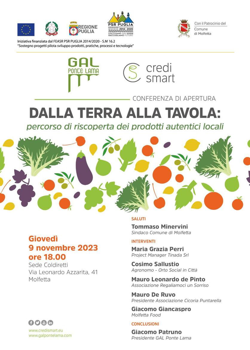 Giovedì 9 novembre 2023 alle ore 18.00, nella sede di coldiretti di Molfetta, si terrà la conferenza di apertura dell’iniziativa “Dalla TERRA alla TAVOLA: un percorso di riscoperta dei PRODOTTI AUTENTICI LOCALI” che rientra nel progetto Cre.Di.Smart, di cui il GAL Ponte Lama è capofila, che sarà gestito dalle associazioni Regaliamoci un Sorriso OdV, Molfetta Food, Cicoria puntarelle Molfettese, Coldiretti Molfetta.