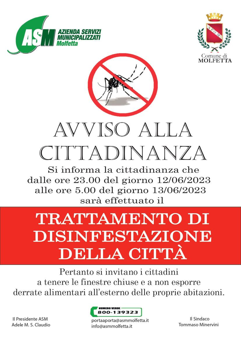 Descrizione Dalle 23 del 12 giugno alle 5 del 13 giugno prossimo l'Asm provvederà alla disinfestazione della città. Pertanto, nelle ore interessate dall'intervnto, è opportuno non esporre derrate alimentari.