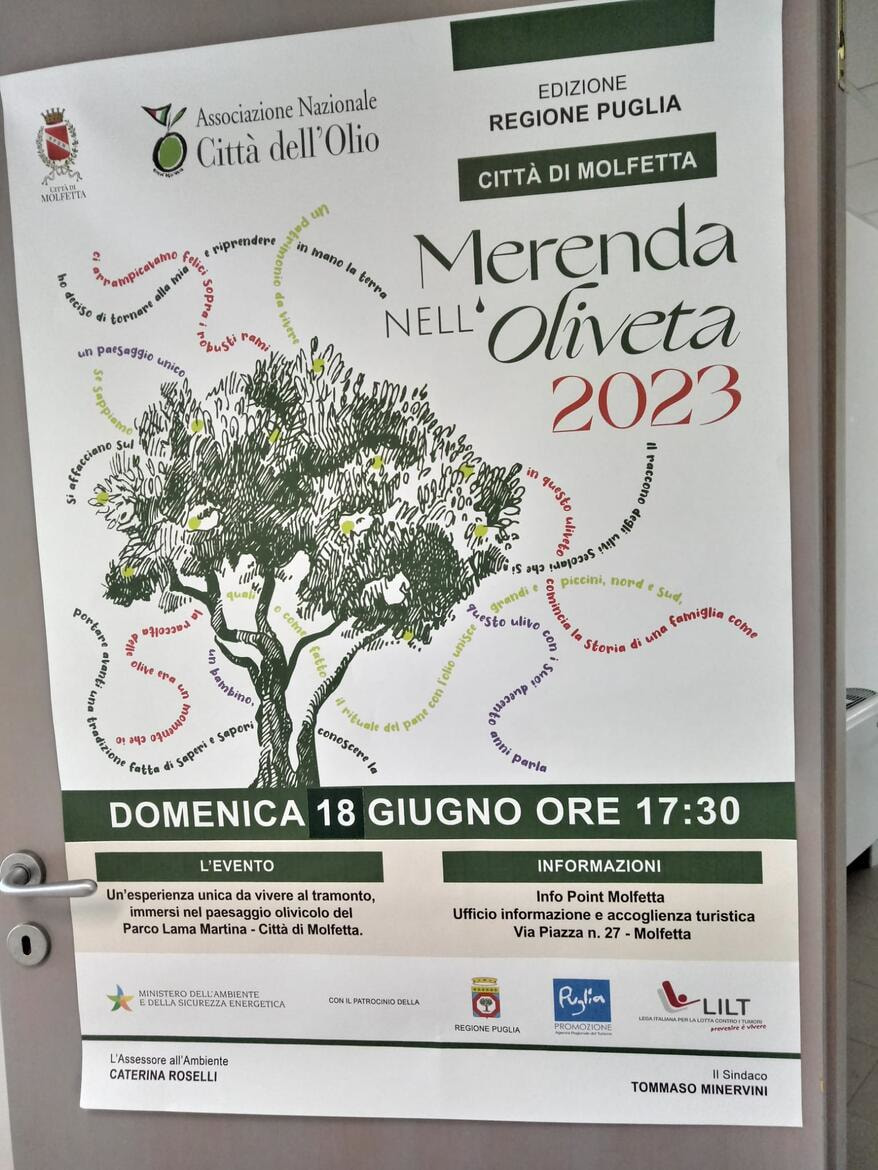 Per motivi organizzativi si terrà domenica 18 giugno, a partire dalle 17.30, (non domenica 11 giugno) l’edizione 2023 della manifestazione “Merenda nell’Oliveta, un’esperienza tutta da vivere nel parco naturale di Lama Martina.