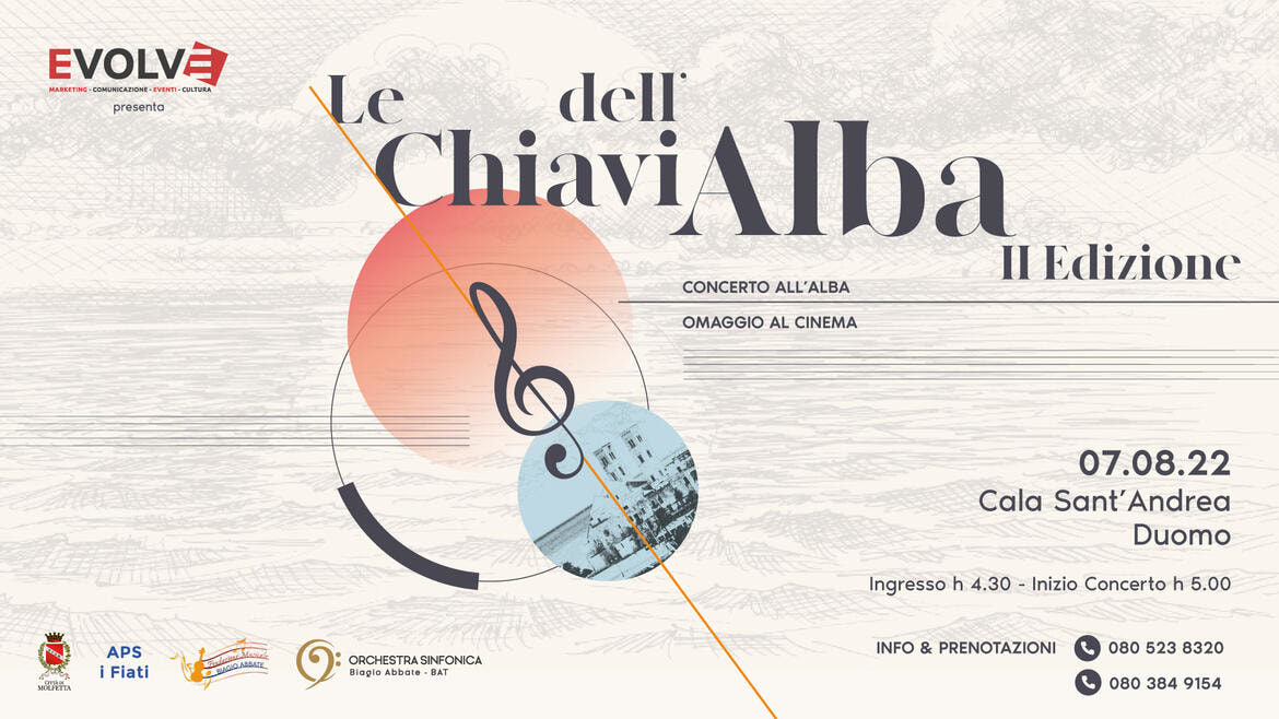 Una passeggiata musicale sulle note delle più conosciute colonne sonore composte dal Maestro Ennio Morricone, da John Williams e non solo. Domenica, 7 agosto, con inizio alle ore 5 (ingresso ore 4.30), torna, a Cala sant’Andrea, per il secondo anno consecutivo, “Chiavi dell’alba”, un evento musicale, un omaggio al cinema, che ripercorre, con l’esecuzione dal vivo, le pagine musicali più belle e conosciute della cinematografia internazionale. L’appuntamento rientra nel cartellone dell’Estate a Molfetta, promosso dall’amministrazione comunale.