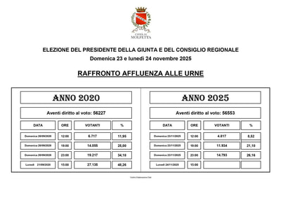 Documenti File allegati Riepilogo affluenze alle 23 (File pdf 22,40 kB) RAFFRONTO 2020 2025 riepilogoaffluenze alle ore 23 di Domenica 23 Novembre 2025 (File pdf 181,14 kB)