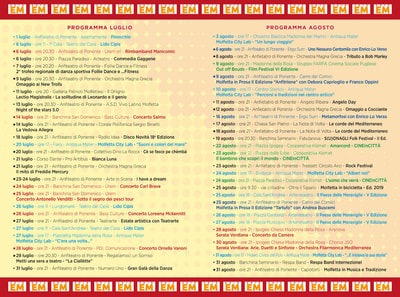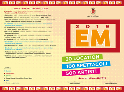 Descrizione Trenta location, cento spettacoli, 500 artisti, Ecco il programma di Eventi Molfetta 2019 promosso dall'assessorato alla cultura. Galleria immagini Eventi Molfetta1 Eventi Molfetta2
