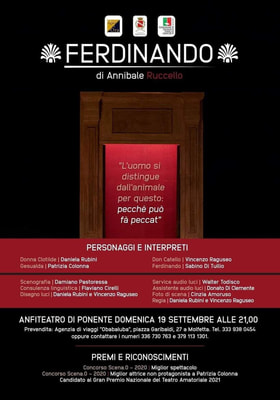 Reduce dal successo ottenuto a Catania una settimana fa, domenica 19 settembre, alle 21, nell’anfiteatro comunale, va in scena Ferdinando, di Annibile Ruccello, commedia teatrale proposta dalla Compagnia Teatrale Qui ed Ora, per la regia di Daniela Rubini e Vincenzo Raguseo. Lo spettacolo, che ha già ottenuto, premi e riconoscimenti al Concorso Scena.0 2020, come miglior spettacolo e miglior attrice non protagonista (Patrizia Colonna), è candidato al Gran Premio nazionale del Teatro amatoriale 2021.