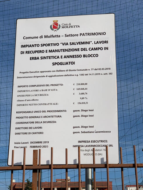 I lavori di recupero e manutenzione del campo di calcetto, tra via Corrado Salvemini e via Papa Giovanni XXIII, per un ammontare di 210mila euro, erano stati affidati, in via definitiva, il 14 novembre scorso.