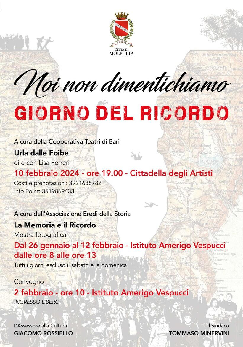 A Molfetta il 10 febbraio, Giorno del Ricordo, presso la Cittadella degli Artisti, la Cooperativa Teatri di Bari, alle ore 19, propone “Urla dalle Foibe” di e con Lisa Ferreri. Costi e prenotazioni presso l’Info Point turistico in via Piazza 27, telefono, 351 98 69 433.