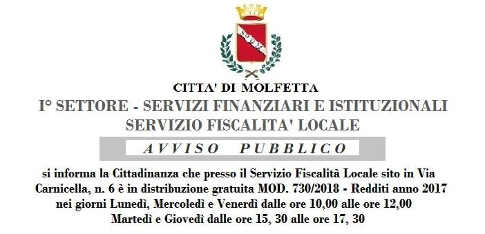 si informa la Cittadinanza che presso il Servizio Fiscalità Locale sito in Via Giovanni Carnicella, n. 6 è in distribuzione gratuita il MOD. 730/2018 - Redditi anno 2017 nei giorni Lunedì, Mercoledì e Giovedì dalle ore 15, 30 alle ore 17, 30.